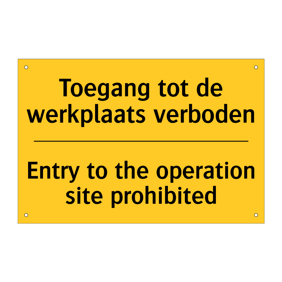Waarschuwingsbord met de tekst Toegang tot de werkplaats verboden / Entry to the operation site prohibited