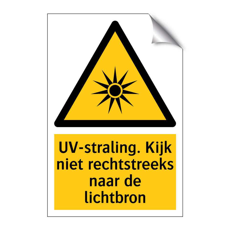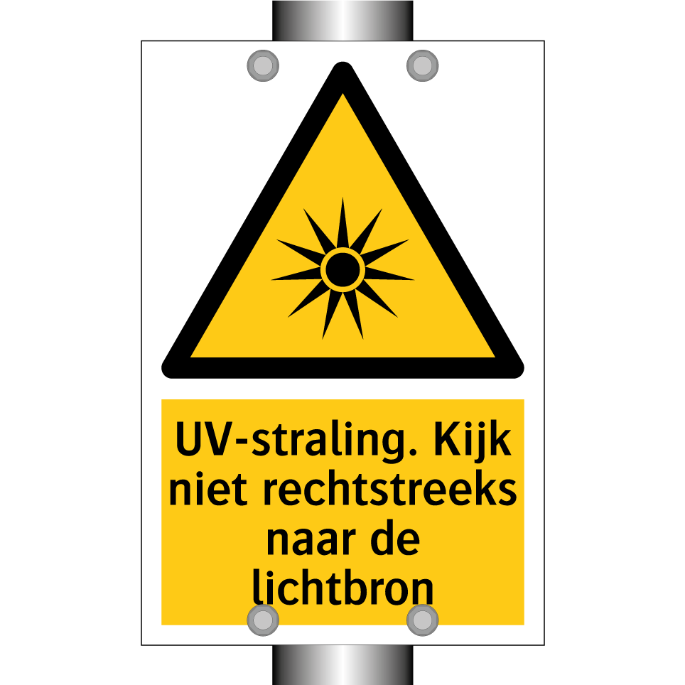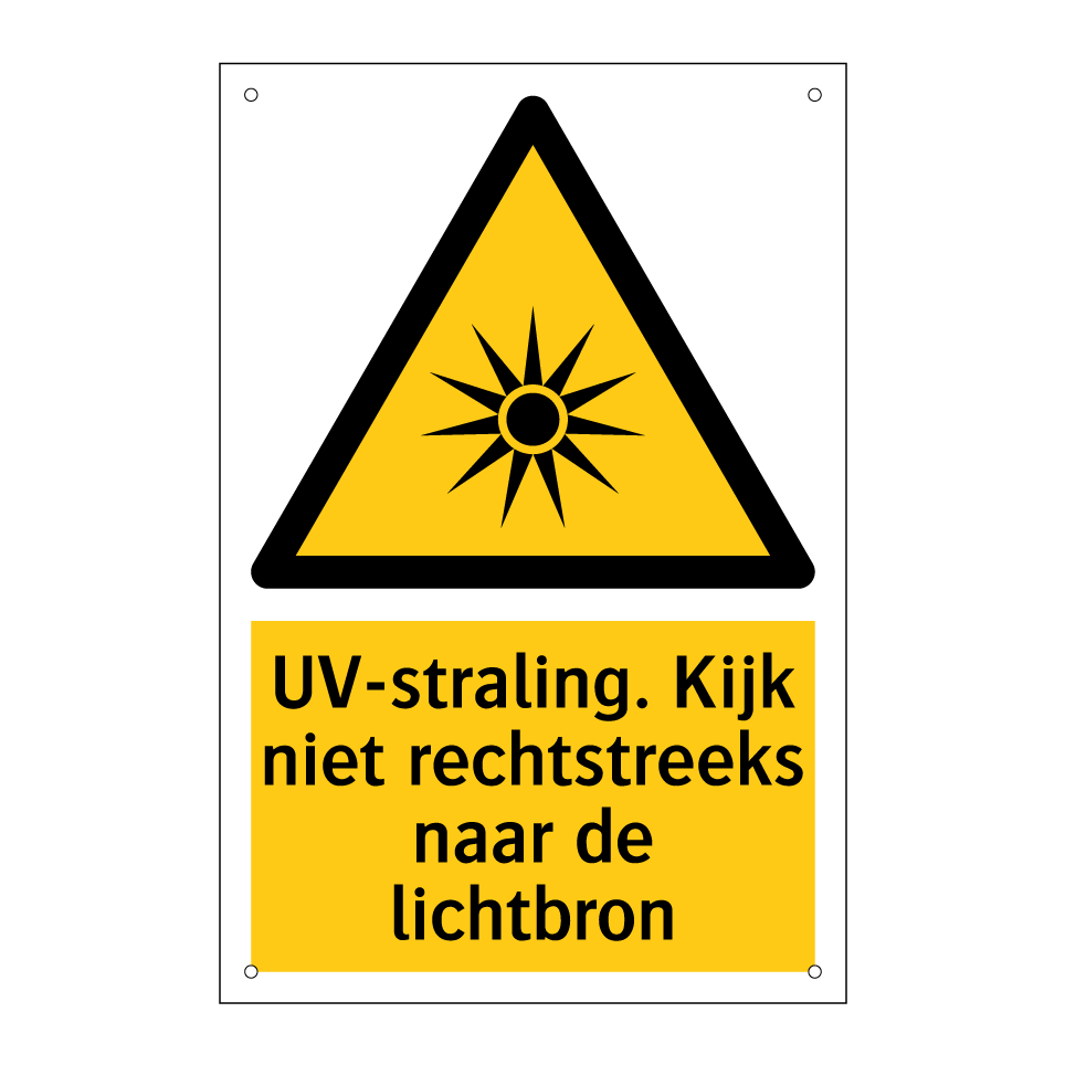 Waarschuwingsbord met de tekst UV-straling. Kijk niet rechtstreeks naar de lichtbron