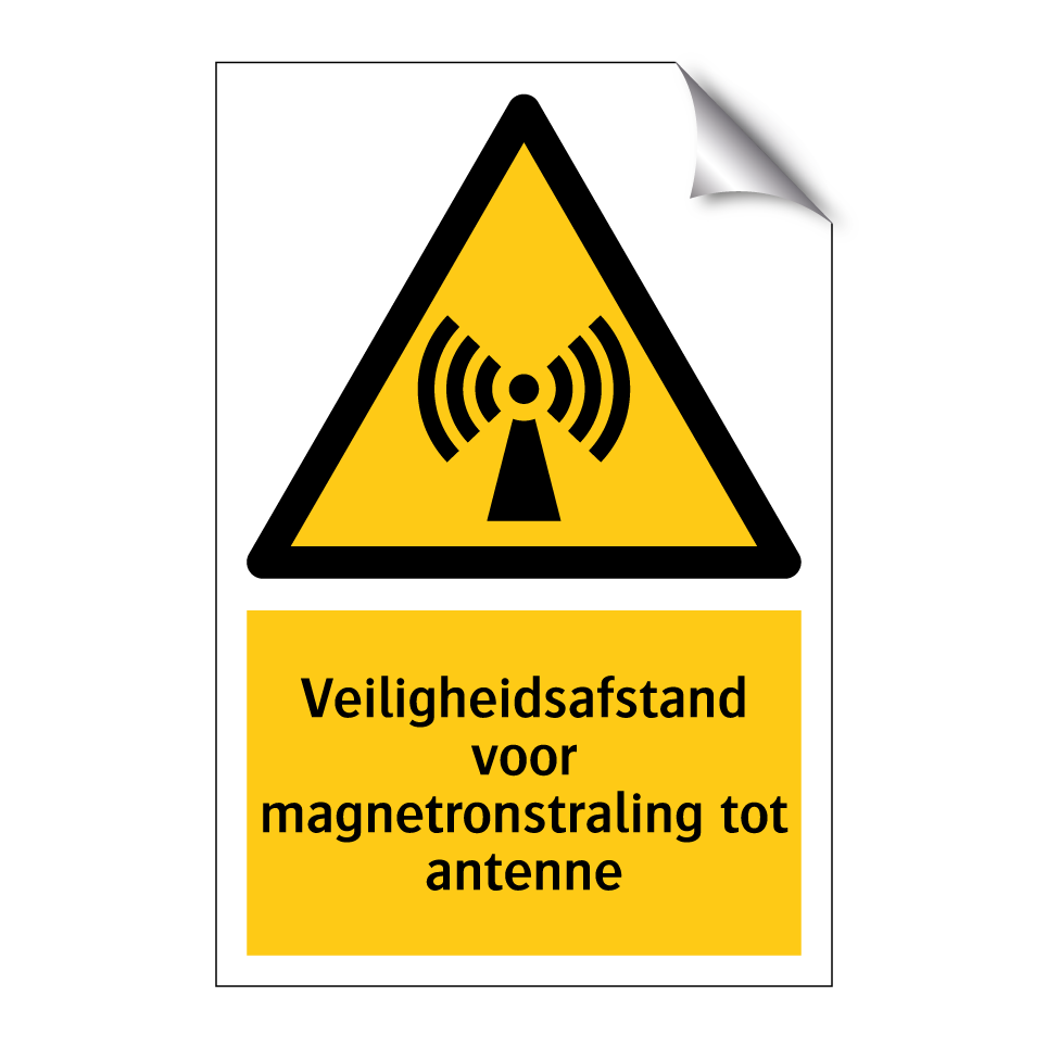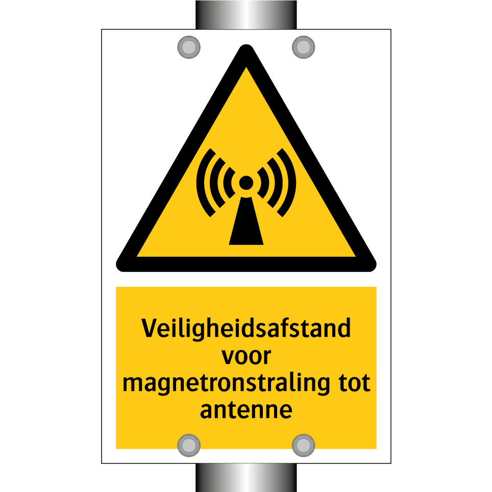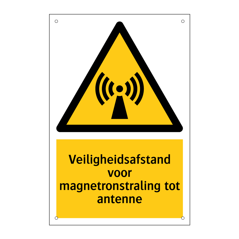 Waarschuwingsbord met de tekst Veiligheidsafstand voor magnetronstraling tot antenne
