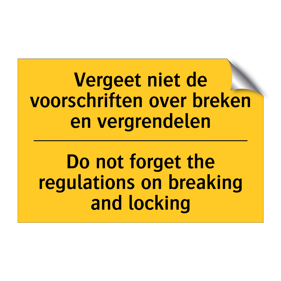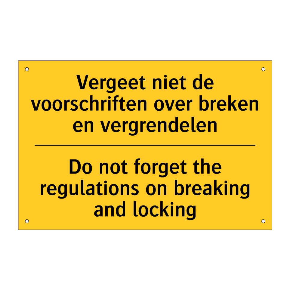 Waarschuwingsbord met de tekst Vergeet niet de voorschriften over breken en vergrendelen / Do not forget the regulations on breaking and locking
