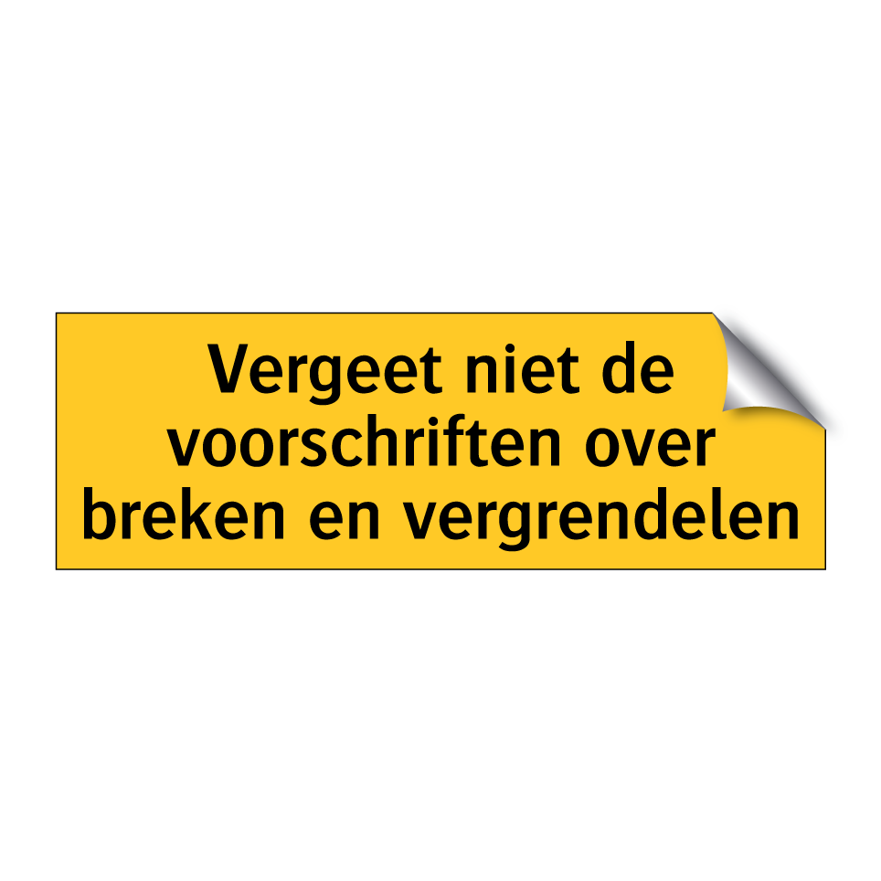 Deze waarschuwingsbord is essentieel voor het waarborgen van de veiligheid op de werkplek. Het herinnert werknemers eraan om de voorschriften met betrekking tot breken en vergrendelen niet te vergeten, wat cruciaal is om ongelukken te voorkomen. Plaats deze bord op strategische locaties zoals bij ingangen van werkruimtes, nabij machines of in opslagruimtes waar veiligheidsprocedures strikt moeten worden nageleefd. Door de opvallende gele achtergrond en zwarte tekst is de boodschap duidelijk zichtbaar en gemakkelijk te begrijpen. Dit waarschuwingsbord helpt bij het handhaven van een veilige werkomgeving en het bevorderen van bewustzijn onder personeel.