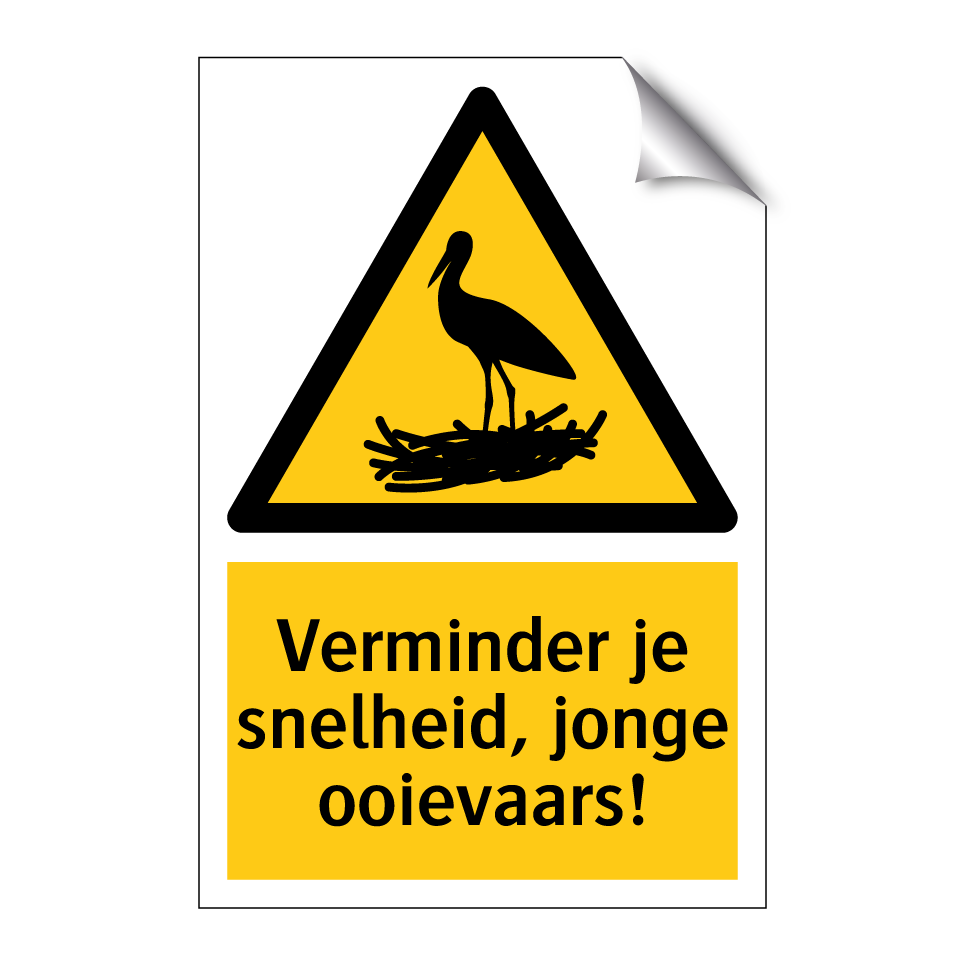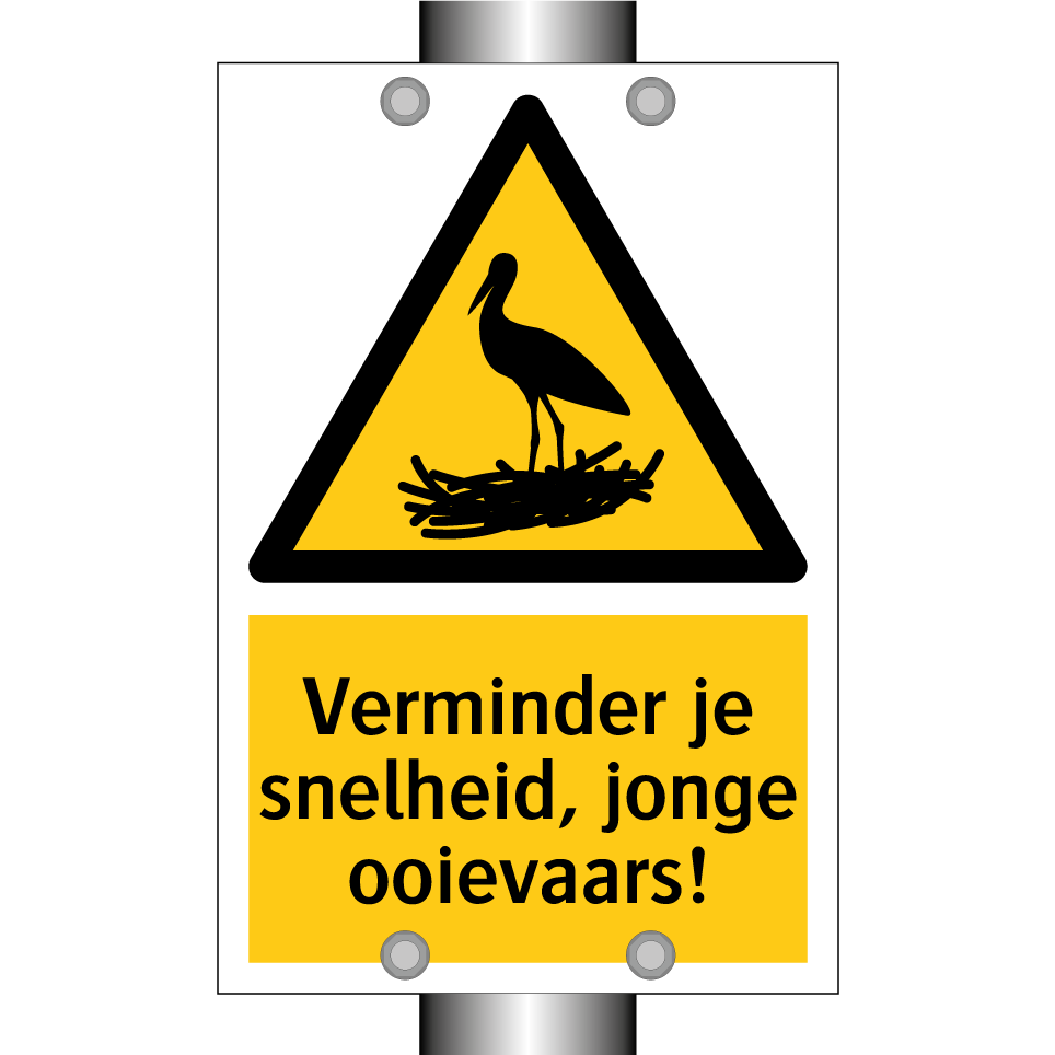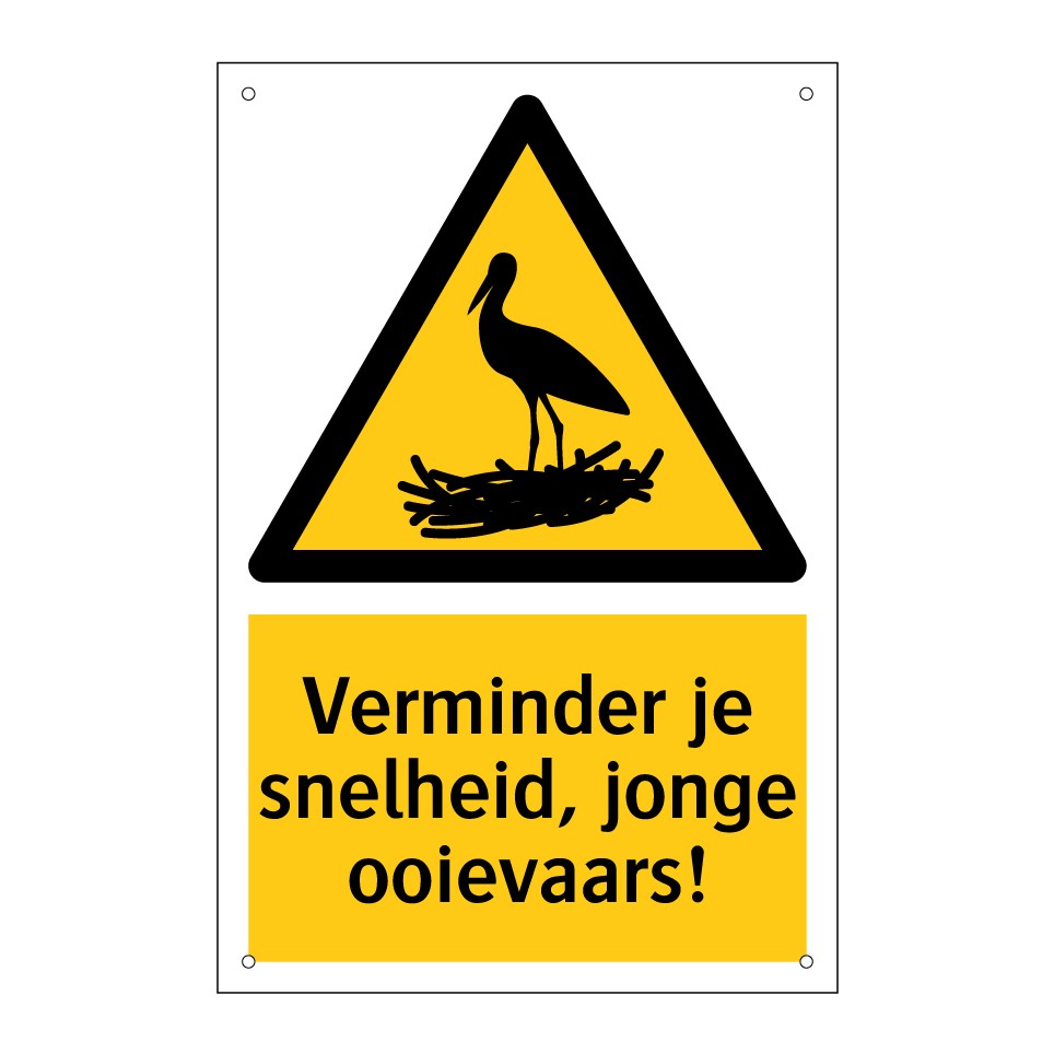 Waarschuwingsbord met de tekst Verminder je snelheid, jonge ooievaars!