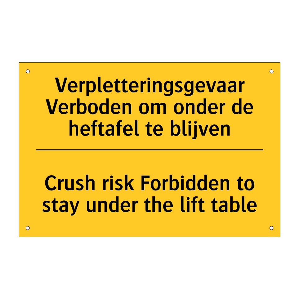 Dit waarschuwingsbord is essentieel voor het waarborgen van de veiligheid in omgevingen waar een heftafel wordt gebruikt. Met een opvallende gele achtergrond en zwarte tekst, trekt dit bordje direct de aandacht en waarschuwt het voor verpletteringsgevaar. De tweetalige tekst, in zowel Nederlands als Engels, zorgt ervoor dat de boodschap duidelijk is voor een breder publiek, wat de veiligheid op de werkplek verhoogt. Plaats dit waarschuwingsbord in werkplaatsen, magazijnen of andere industriële omgevingen waar heftafels aanwezig zijn. Door de strategische plaatsing van dit bordje worden werknemers en bezoekers effectief gewaarschuwd om niet onder de heftafel te blijven, wat bijdraagt aan een veiligere werkomgeving.