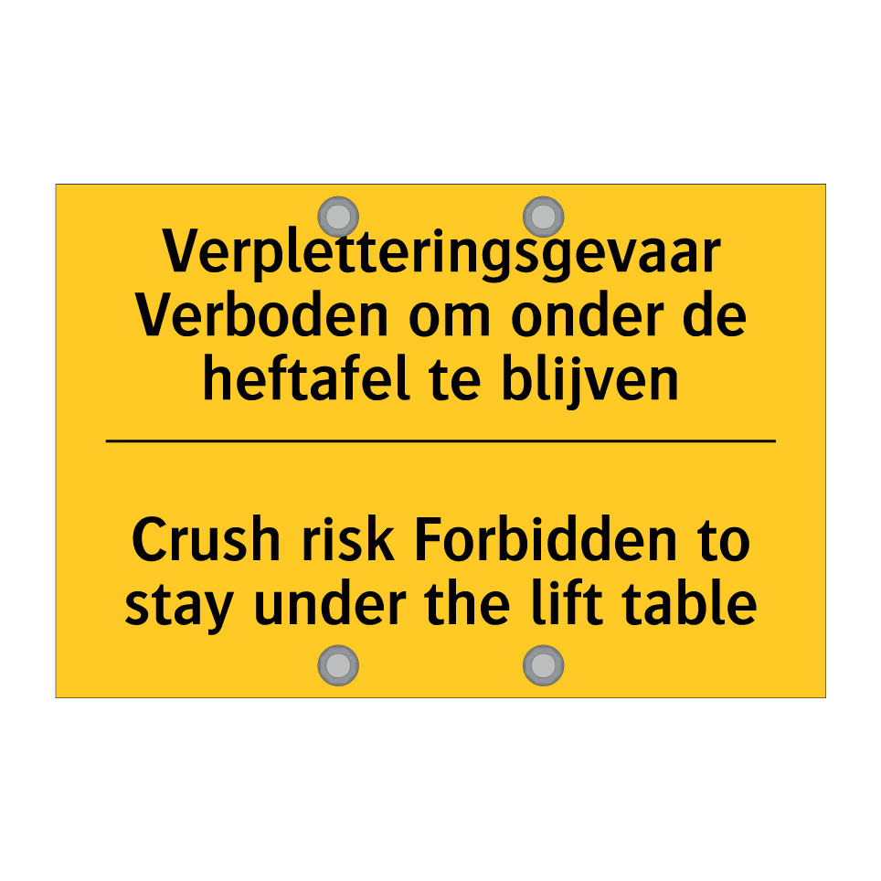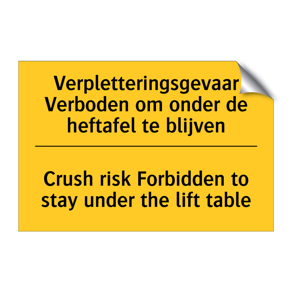 Waarschuwingsbord met de tekst Verpletteringsgevaar Verboden om onder de heftafel te blijven / Crush risk Forbidden to stay under the lift table
