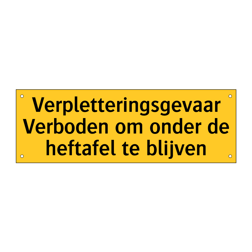 Deze waarschuwingsbord is essentieel voor het waarborgen van de veiligheid in omgevingen waar een heftafel wordt gebruikt. Plaats deze bord op goed zichtbare locaties in werkplaatsen, magazijnen of industriële omgevingen om personeel te waarschuwen voor het gevaar van verplettering. Door de opvallende gele achtergrond en zwarte tekst trekt deze bord onmiddellijk de aandacht, waardoor het risico op ongelukken aanzienlijk wordt verminderd. Ideaal voor gebruik in gebieden waar zware machines en apparatuur worden bediend, helpt deze waarschuwingsbord om een veilige werkomgeving te handhaven en werknemers te beschermen tegen potentieel gevaarlijke situaties.