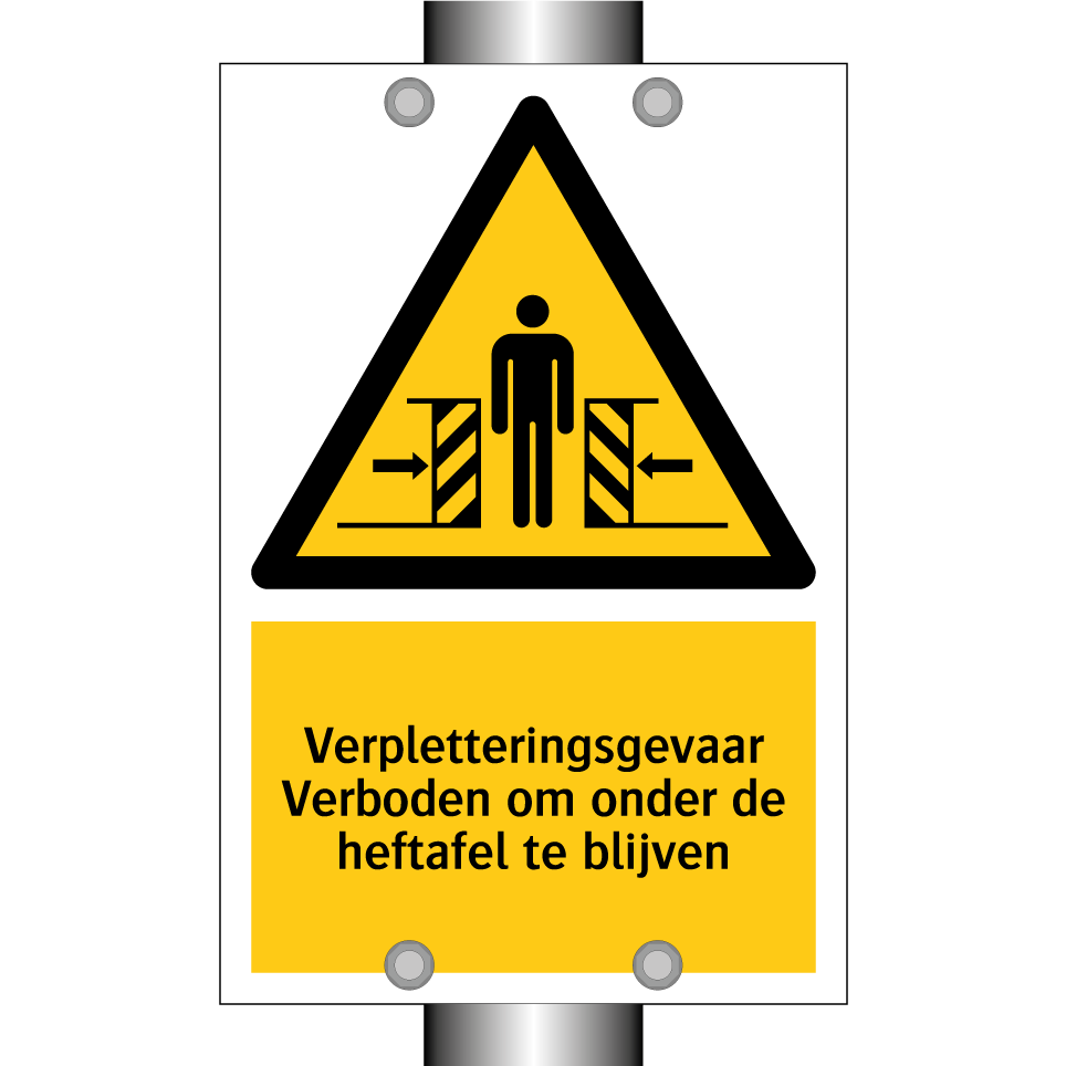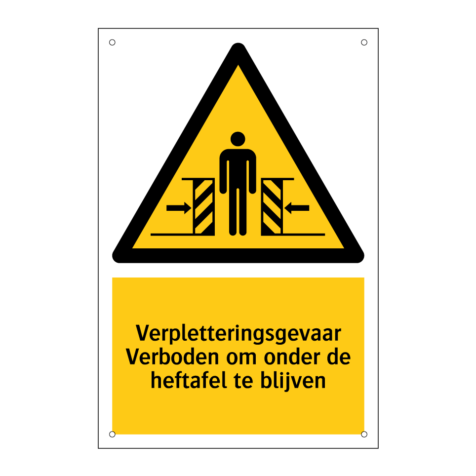 Deze waarschuwingsbord is essentieel voor het waarborgen van de veiligheid in omgevingen waar een heftafel wordt gebruikt. Het bord waarschuwt voor het gevaar van verplettering en geeft duidelijk aan dat het verboden is om onder de heftafel te blijven. Ideaal voor gebruik in magazijnen, werkplaatsen en industriële omgevingen, helpt deze waarschuwingsbord om werknemers te beschermen tegen ernstige ongevallen. Plaats het bord op goed zichtbare locaties in de buurt van heftafels om ervoor te zorgen dat iedereen zich bewust is van de potentiële gevaren. Door deze waarschuwingsbord te installeren, draagt u bij aan een veiligere werkomgeving.