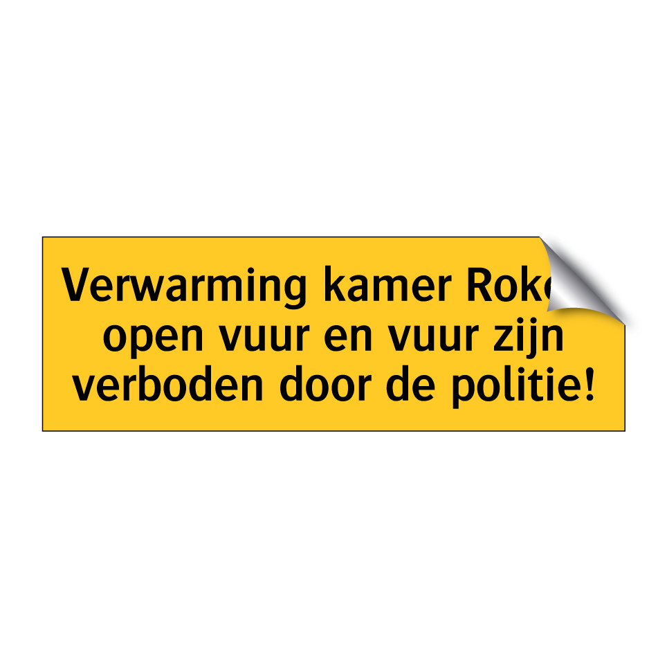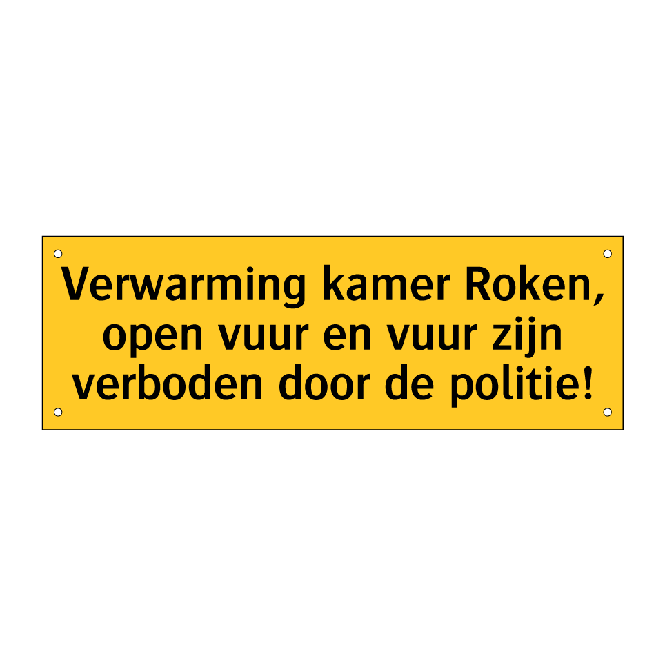 Waarschuwingsbord met de tekst Verwarming kamer Roken, open vuur en vuur zijn verboden door de politie!