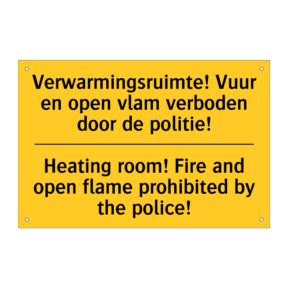 Waarschuwingsbord met de tekst Verwarmingsruimte! Vuur en open vlam verboden door de politie! / Heating room! Fire and open flame prohibited by the police!