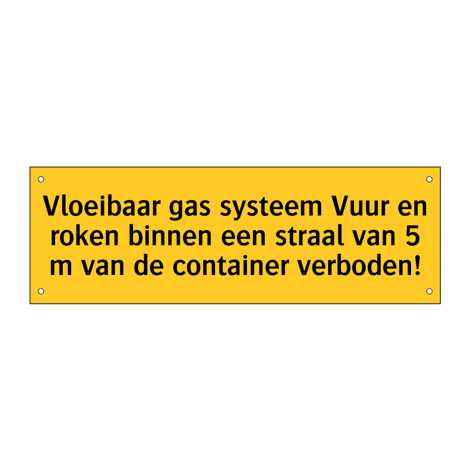Waarschuwingsbord met de tekst Vloeibaar gas systeem Vuur en roken binnen een straal van 5 m van de container verboden!