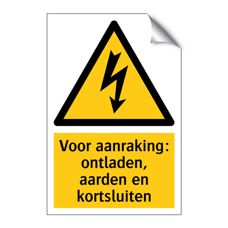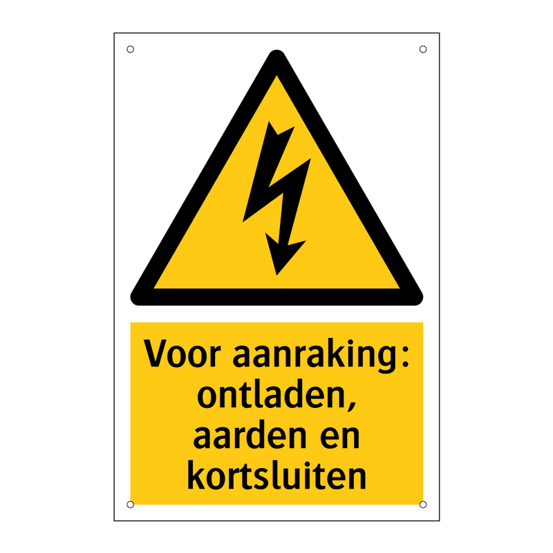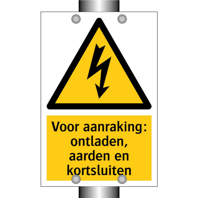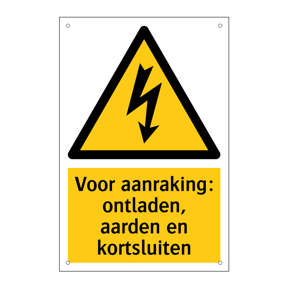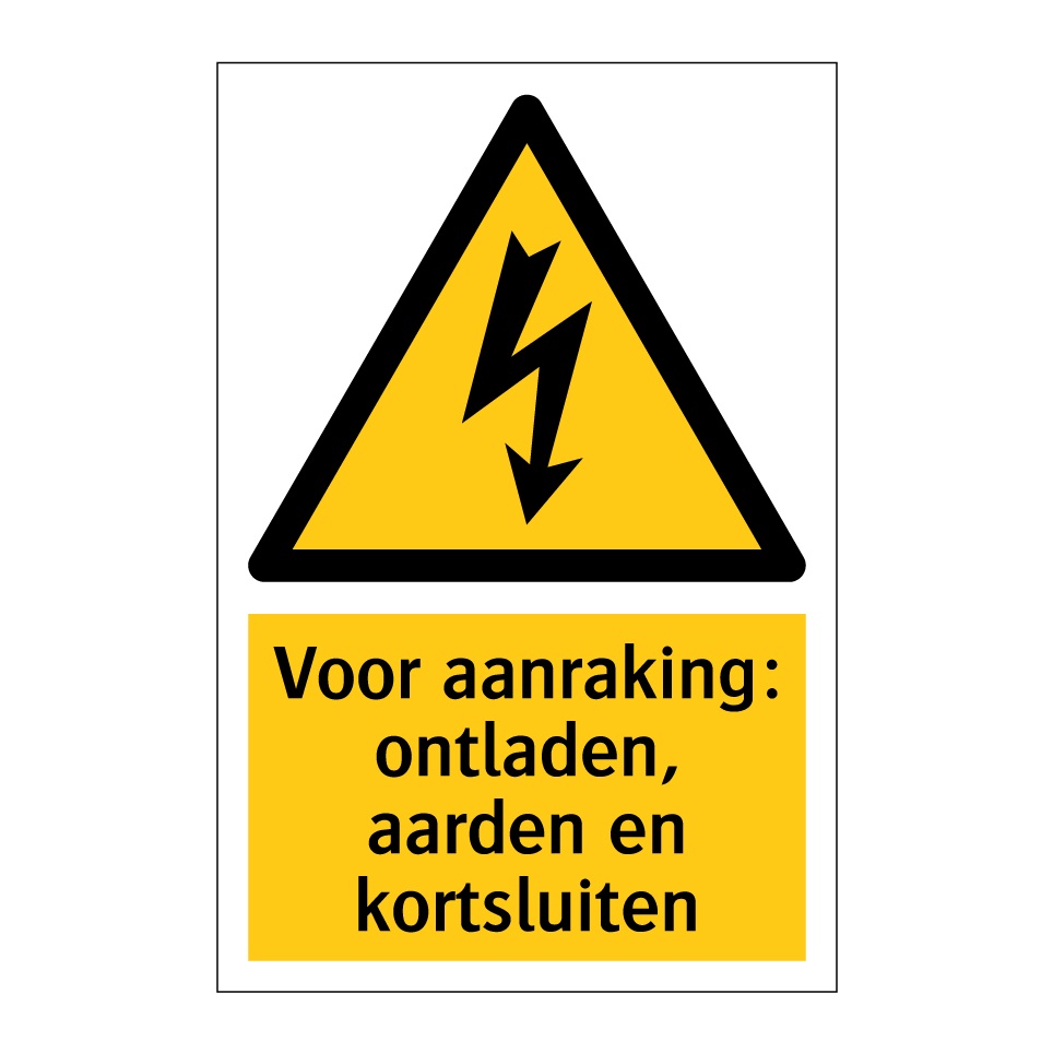 Waarschuwingsbord met de tekst Voor aanraking: ontladen, aarden en kortsluiten
