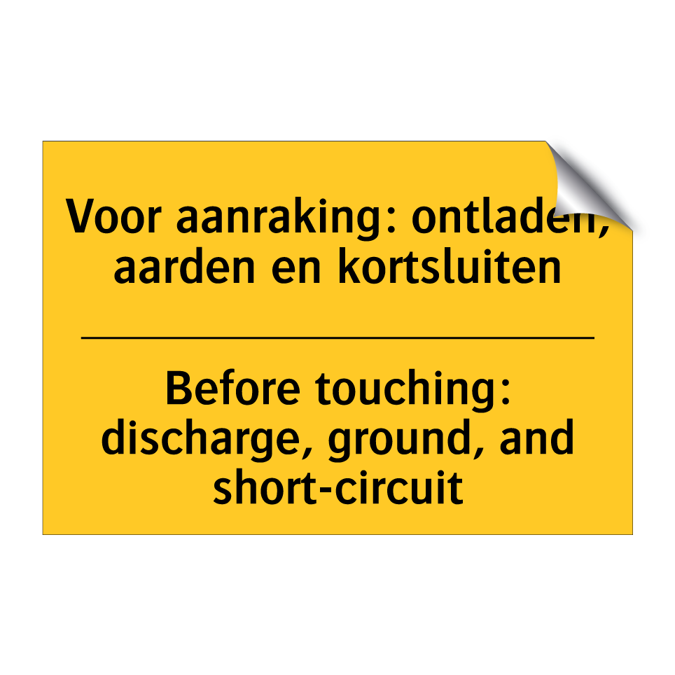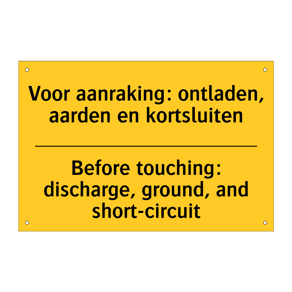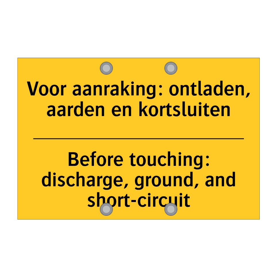 Waarschuwingsbord met de tekst Voor aanraking: ontladen, aarden en kortsluiten / Before touching: discharge, ground, and short-circuit