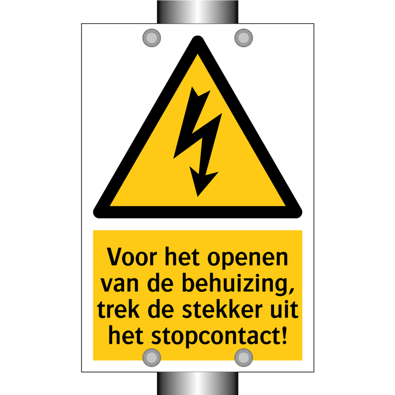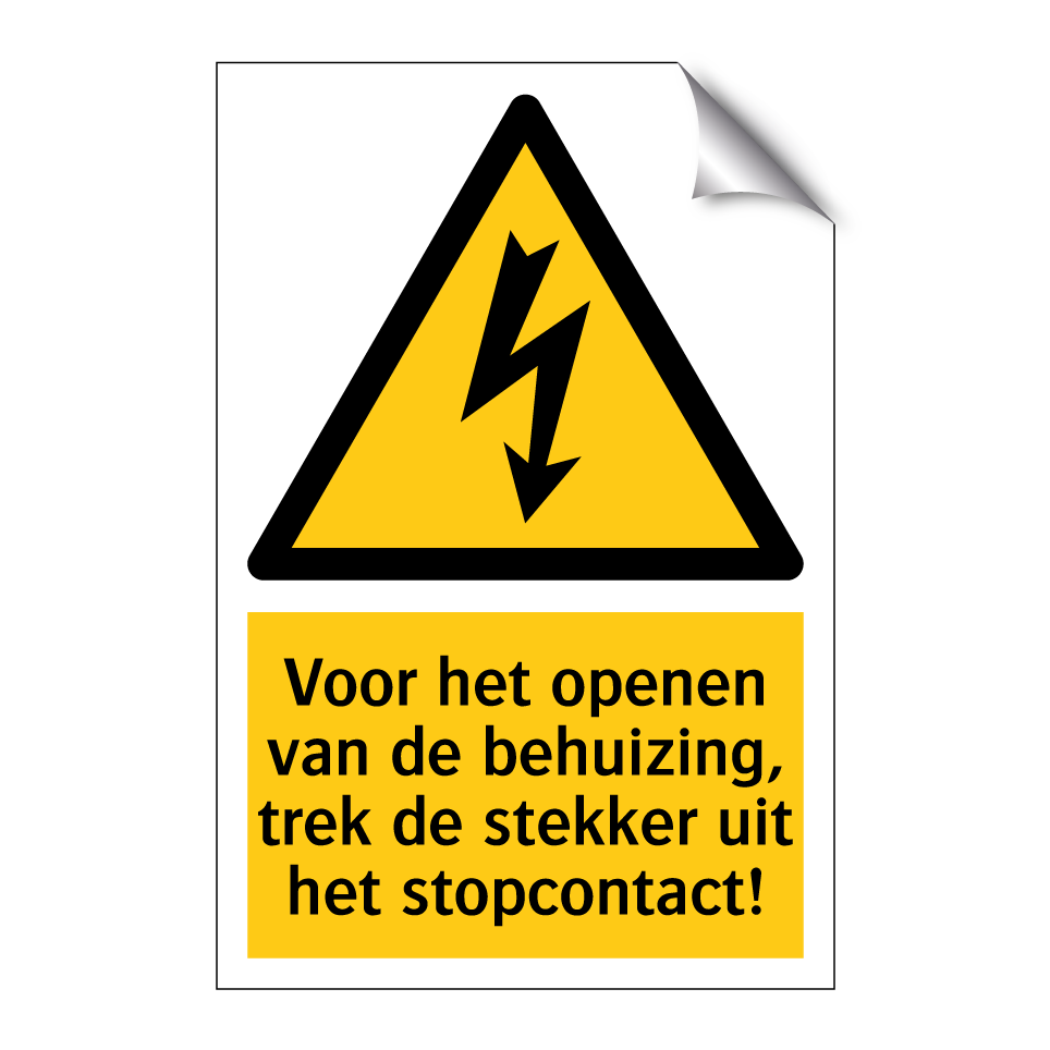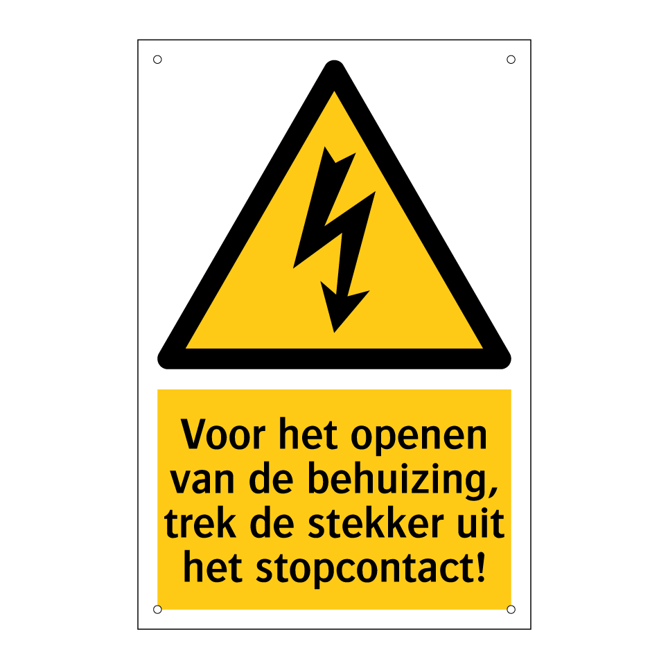 Waarschuwingsbord met de tekst Voor het openen van de behuizing, trek de stekker uit het stopcontact!