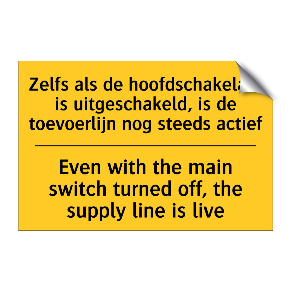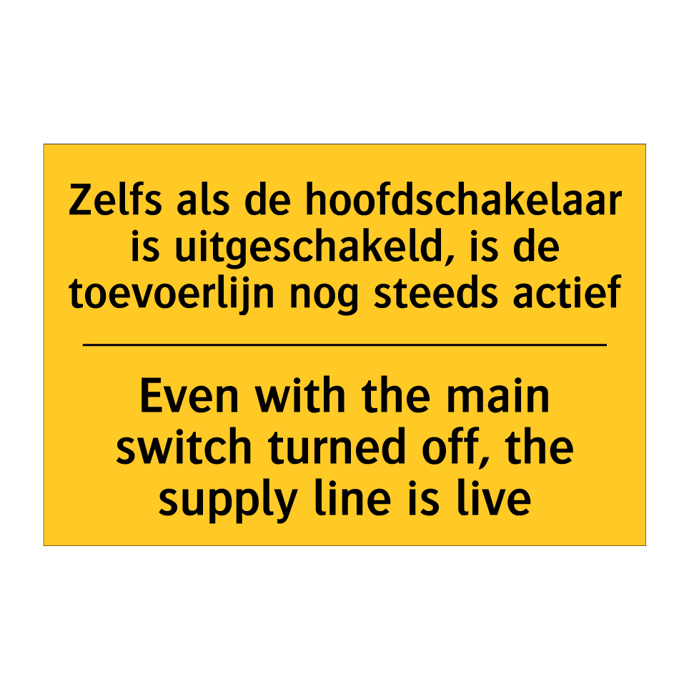 Waarschuwingsbord met de tekst Zelfs als de hoofdschakelaar is uitgeschakeld, is de toevoerlijn nog steeds actief / Even with the main switch turned off, the supply line is live