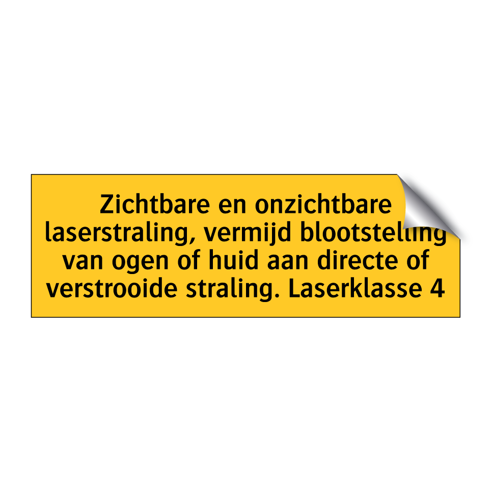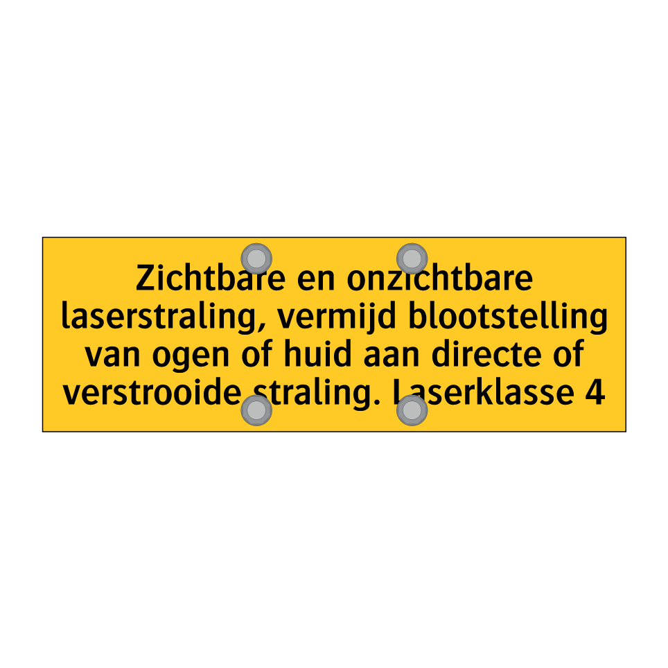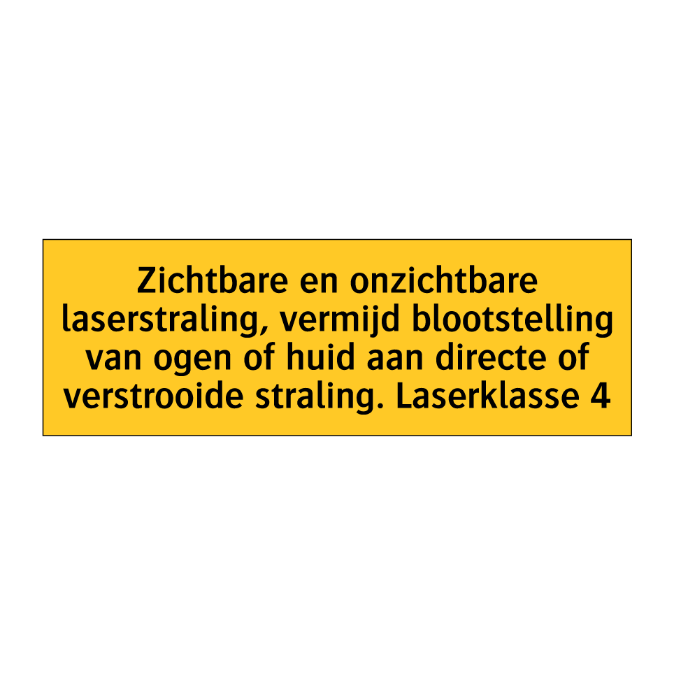 Waarschuwingsbord met de tekst Zichtbare en onzichtbare laserstraling, vermijd blootstelling van ogen of huid aan directe of verstrooide straling. Laserklasse 4