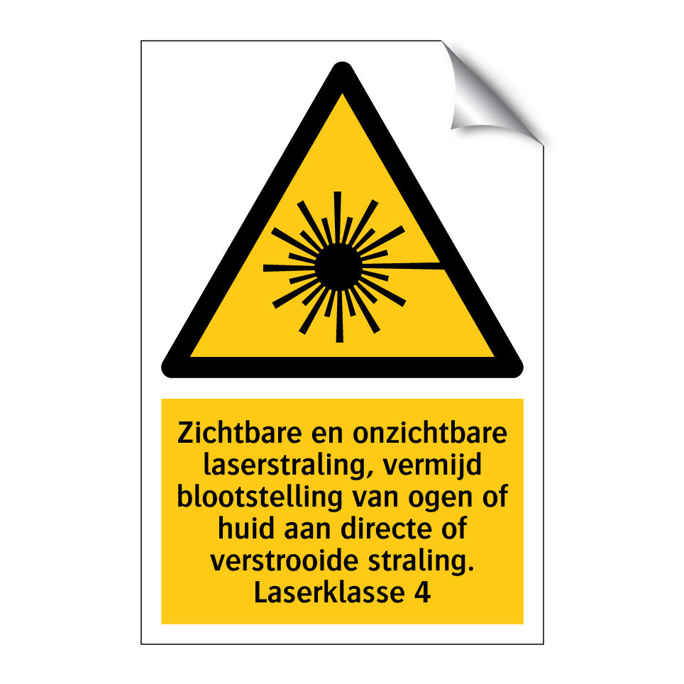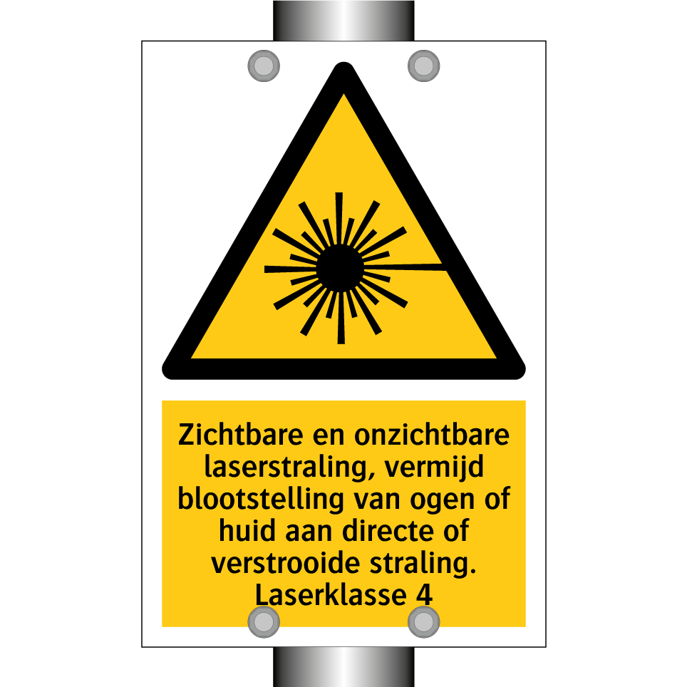 Waarschuwingsbord met de tekst Zichtbare en onzichtbare laserstraling, vermijd blootstelling van ogen of huid aan directe of verstrooide straling. Laserklasse 4